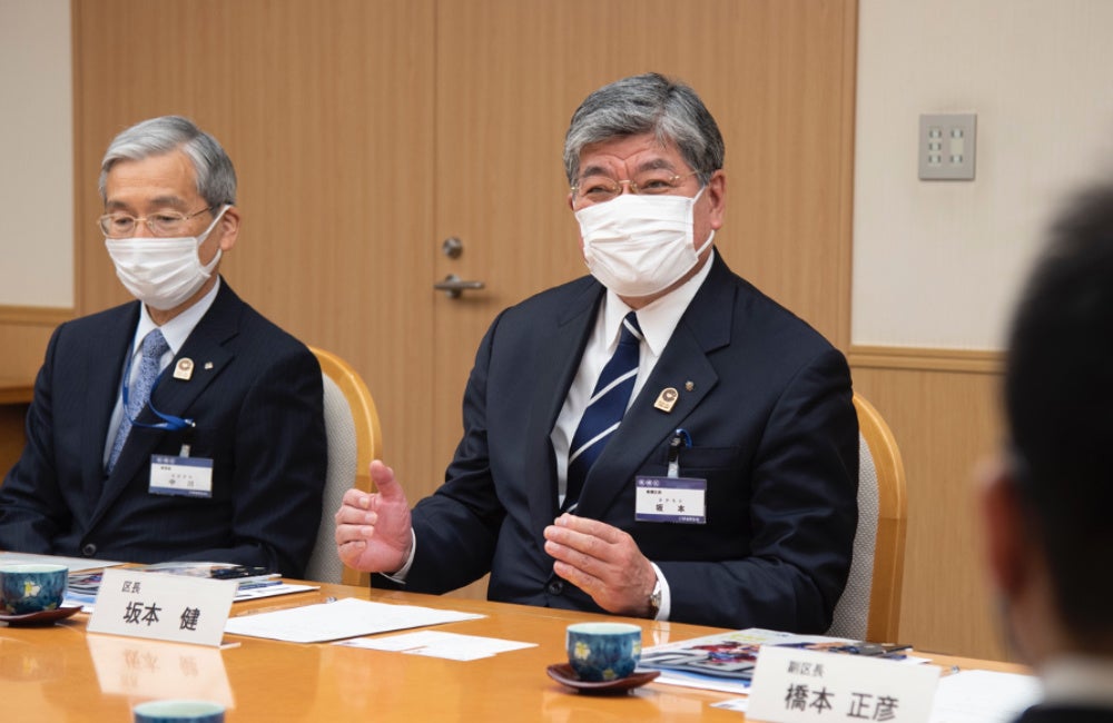 左より坂本健 板橋区長、大橋博 学校法人創志学園 理事長