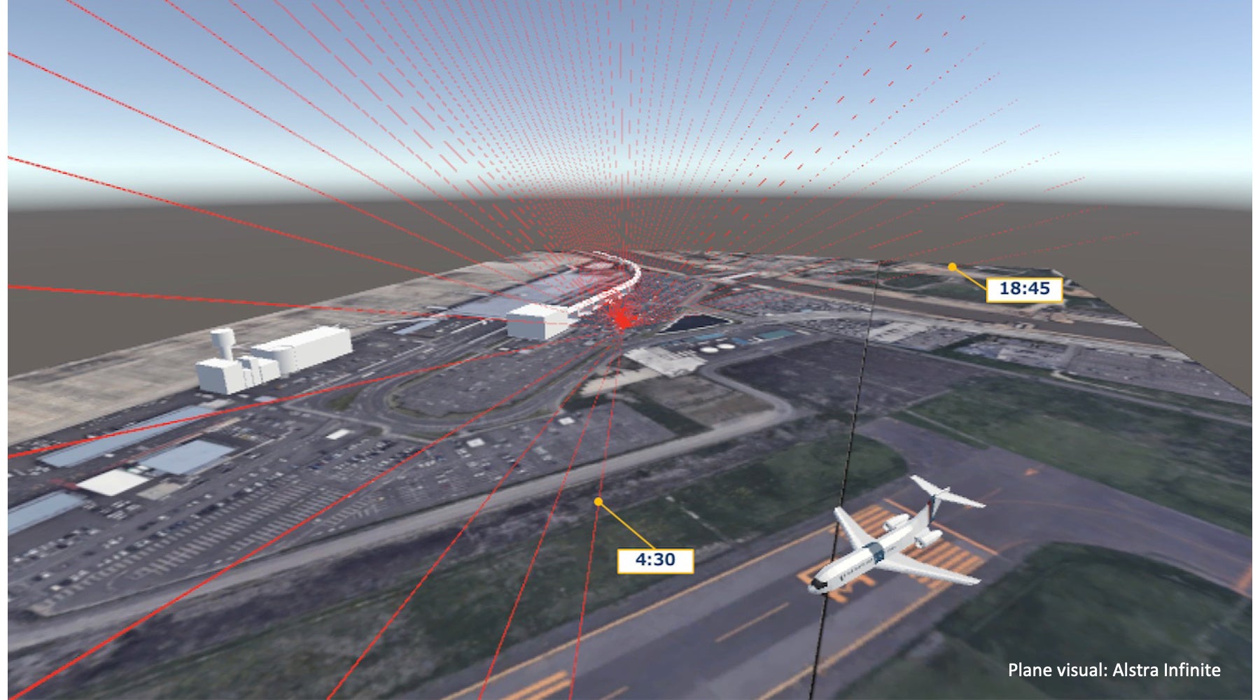 対象地点:①上空の飛行機、②A滑走路、③管制塔、④空港アクセス鉄道