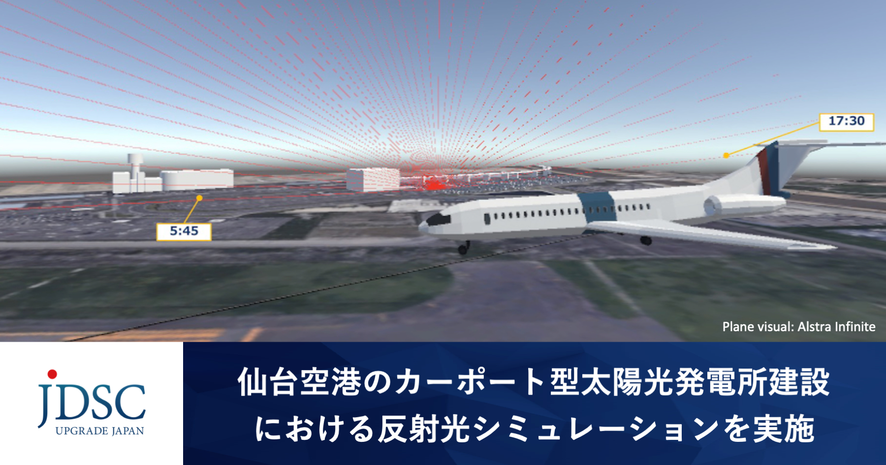 株式会社JDSC(本社:東京都文京区、代表取締役:加藤 エルテス 聡志、以下「JDSC」)は、東急不動産株式会社(本社:東京都渋谷区、代表取締役社長 社長執行役員:星野 浩明)が参画する仙台空港お客様第1駐車場内カーポート型太陽光発電所建設事業に際し、太陽光パネル設置時の反射光シミュレーションを同社から受注し、実施しましたので、お知らせします。