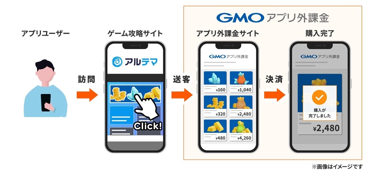 ゲーム攻略サイト「アルテマ」のユーザーは、課金したいアイテムなどのバナーをクリックすると、GMO TECHが管理する『GMOアプリ外課金』のアイテム販売サイトに遷移し、『GMOアプリ外課金』で決済を行います。これにより、「アルテマ」はゲーム攻略情報の提供に加え、サイト内で紹介するアイテムの販売において、アプリ外課金ならではの限定コンテンツなどの付加価値を提供することが可能となります。