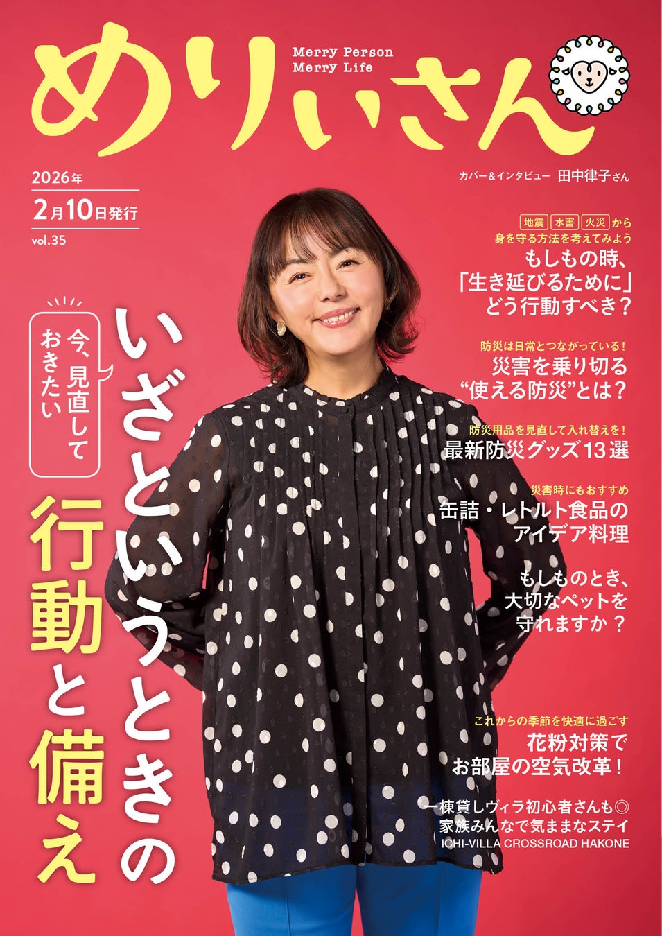 特集「今、見直しておきたい いざというときの行動と備え」/表紙&インタビュー田中律子さん/情報誌『めりぃさん』vol.35 2月10日発刊