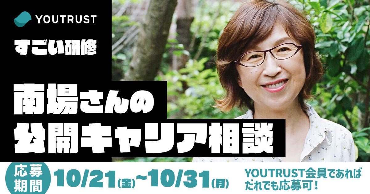 キャリアSNSおよびHR Tech SaaS「YOUTRUST」を提供する株式会社YOUTRUST(本社:東京都渋谷区、代表取締役CEO:岩崎由夏)は、株式会社デライト・ベンチャーズ(本社:東京都渋谷区、代表:南場智子、渡辺大)と共催で「すごい研修〜南場さんの公開キャリア相談〜」として、DeNAファウンダー南場氏に起業に関するキャリア相談ができる会(無償)を開催いたします。