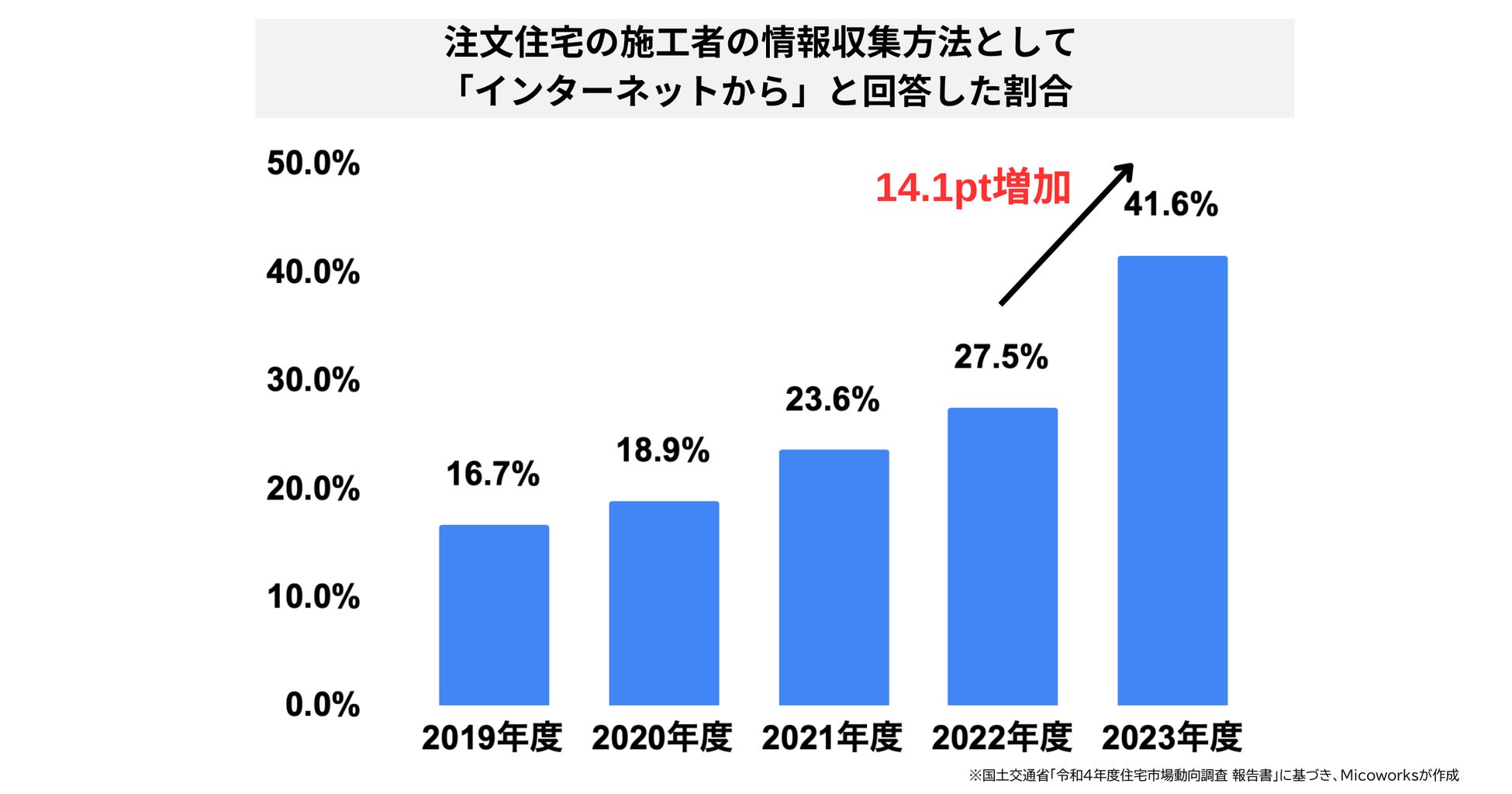 コロナ禍を契機に、インターネットを中心とした生活者の購買行動がより加速しています。国土交通省の「令和4年度住宅市場動向調査 報告書」によると注文住宅施工者に関する情報収集方法として「インターネット」は41.6%と、前年度の27.5%から14.1ポイント増加しています。(※1)