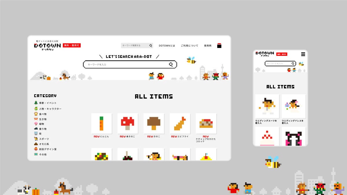 クリエイター集団「前田デザイン室(現:マエデ)」が制作した、粗ドット素材をダウンロードできるサイトです。粗ドットとは、可能な限り低い解像度で、究極に抽象的な表現をしたドット絵を指しています。レトロゲームを想起させる素材の魅力があり、全素材無料ダウンロード・商用利用が可能で、広告表示がない設計となっています。日本のみならず海外でも利用されています。