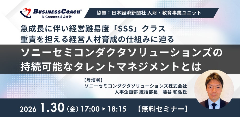 ビジネスコーチ株式会社(本社:東京都港区、代表取締役社長:細川 馨、東証グロース:9562、以下当社)は、1月30日(金)に、ソニーセミコンダクタソリューションズ株式会社 人事企画部 統括部長 藤谷和弘氏をお招きし特別セミナーを開催いたします。