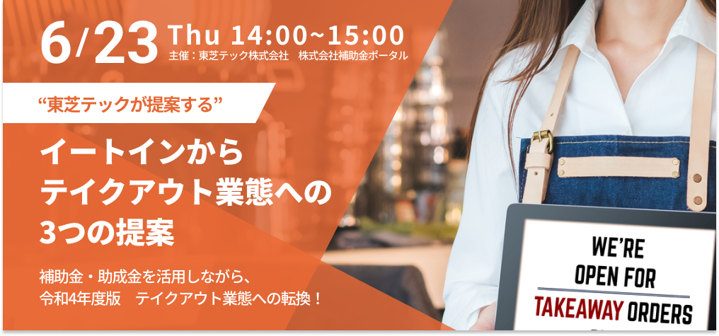 株式会社補助金ポータル(本社:東京都渋谷区、代表取締役:福井彰次 以下、補助金ポータル)は、東芝テック株式会社(本社:東京都品川区、代表取締役:錦織弘信 以下、東芝テック)と補助金・助成金を活用したテイクアウト業態への転換についてご紹介する無料オンラインセミナーを開催します。Zoomでお気軽にご視聴いただけますので、ぜひご参加ください。