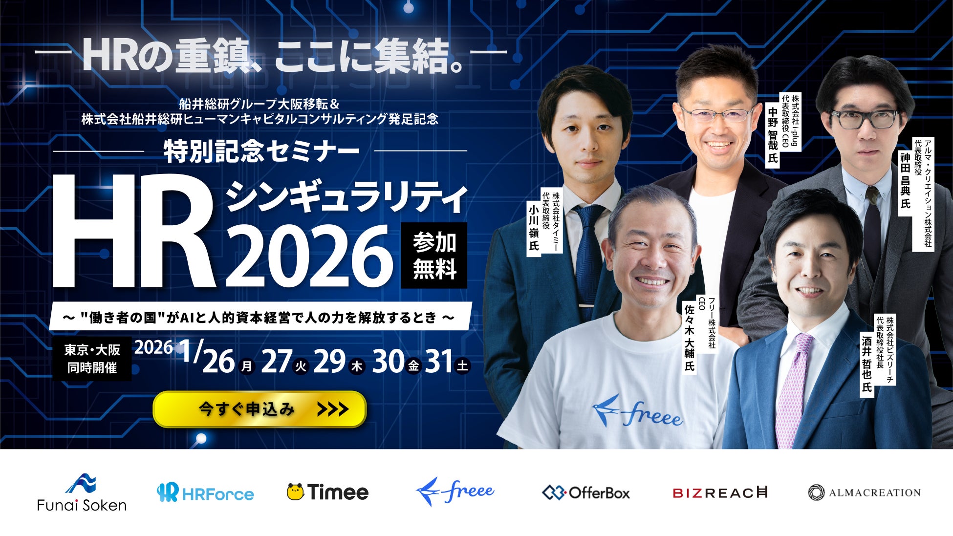 この未曾有の経営課題に挑むため、本セミナーでは株式会社アルマクリエイション・株式会社i-plug・株式会社ビズリーチ・株式会社タイミー・フリー株式会社、HR業界の最前線で変革をリードするトップランナー6名を招聘いたしました。