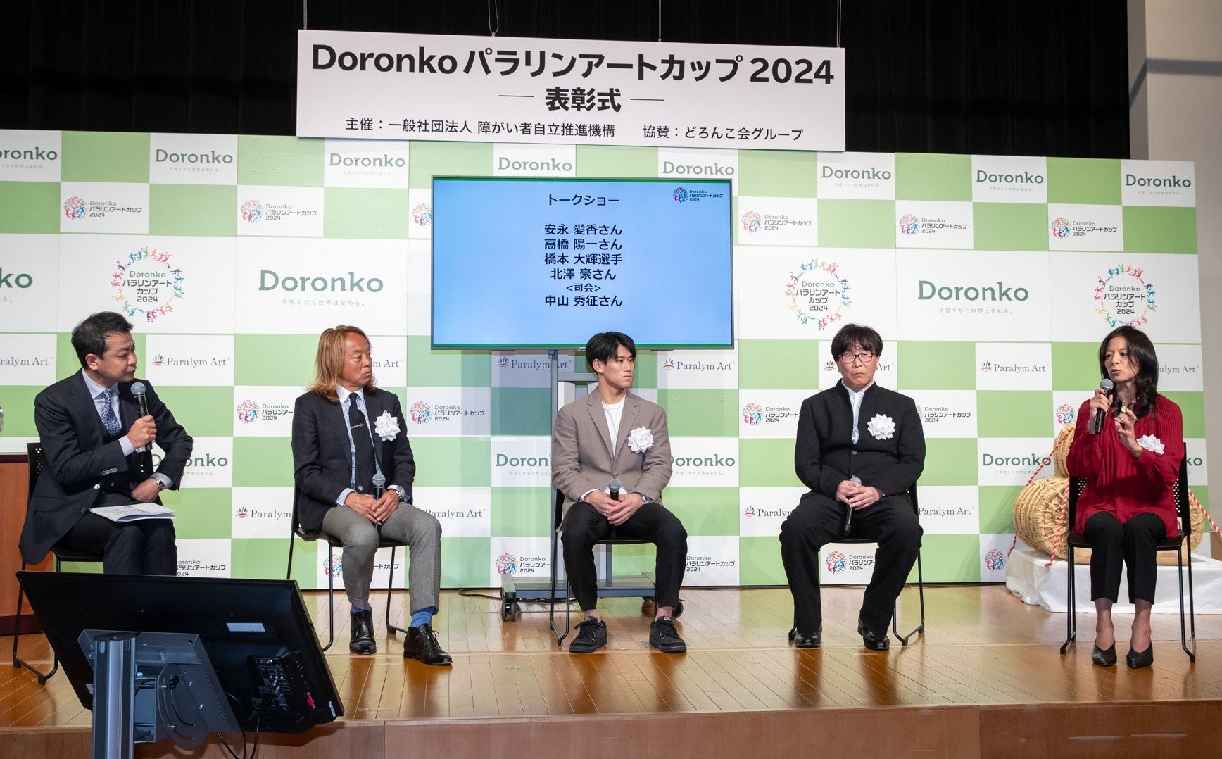 表彰式には多くの著名人がプレゼンターとして登壇しました。パリオリンピックの年にふさわしい特別ゲストとして、男子体操団体金メダリスト、体操界のスターである橋本大輝選手が招かれました。パラリンアートカップの初回から審査員を務める『キャプテン翼』作者の高橋陽一さん、元サッカー日本代表で日本障がい者サッカー連盟会長を務める北澤豪さん、そして一般社団法人障がい者自立推進機構理事でタレントの中山秀征さんがプレゼンターを務めました。安永愛香を交えたミニトークセッションも行われ、作品選出の難しさや、受賞作品の感想などを語り合いました。