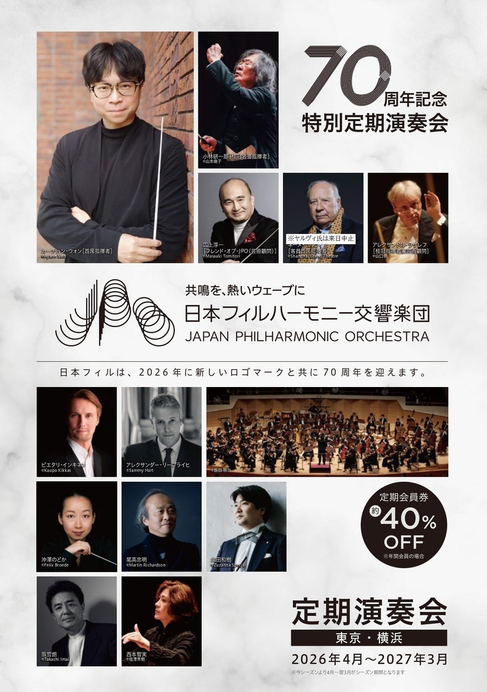 2026年6月に創立70周年を迎える公益財団法人日本フィルハーモニー交響楽団(東京都杉並区、理事長:石塚邦雄)は、2026年4月~2027年3月<70周年シーズン>の記念特別定期会員券を12月11日(木)より発売いたします。