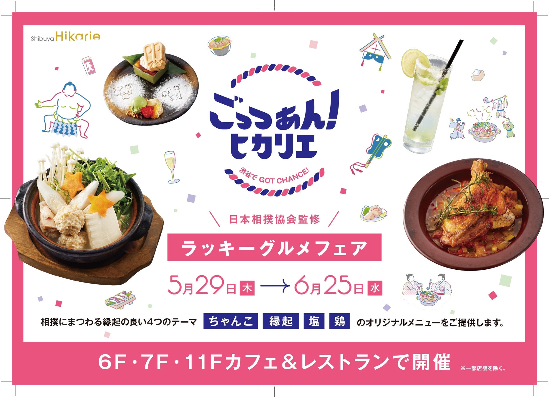 渋谷ヒカリエ6階・7階・11階のカフェ&レストランでは、「ラッキーグルメフェア」を開催します。「食べて運気UP!」というコンセプトのもと、相撲にまつわる縁起の良い「ちゃんこ」「縁起」「鶏」「塩」という4つのテーマを楽しめるオリジナルメニューを、日本相撲協会監修のもと提供します。美味しく食べて運気をチャージできる限定メニューが渋谷ヒカリエに勢揃いします。