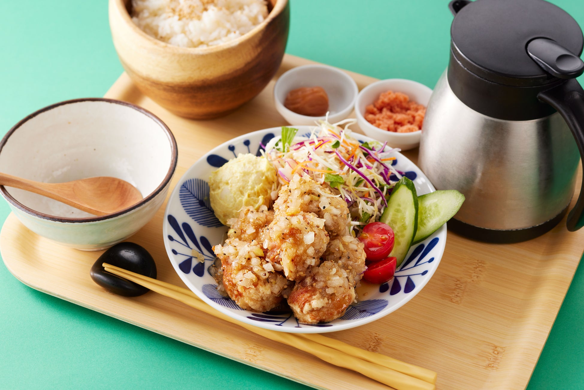 鶏もも肉の唐揚げを、ごまと玉ねぎをたっぷり使った特製塩だれで味わう御膳。食べ応えのある唐揚げに、選べるトッピングと特製かつお出汁をかければ、お茶漬けとしても楽しめる、二度美味しい逸品です。