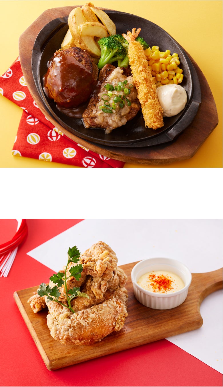 土俵を模した鉄板に、人気No.1の手作りデミグラスハンバーグとジューシーなチキンが乗ったコンボプレート。濃厚デミグラスソースのコクとチキンの香ばしさ、ネギ塩ソースが絶妙なハーモニーを奏で、食欲をそそる一品です。