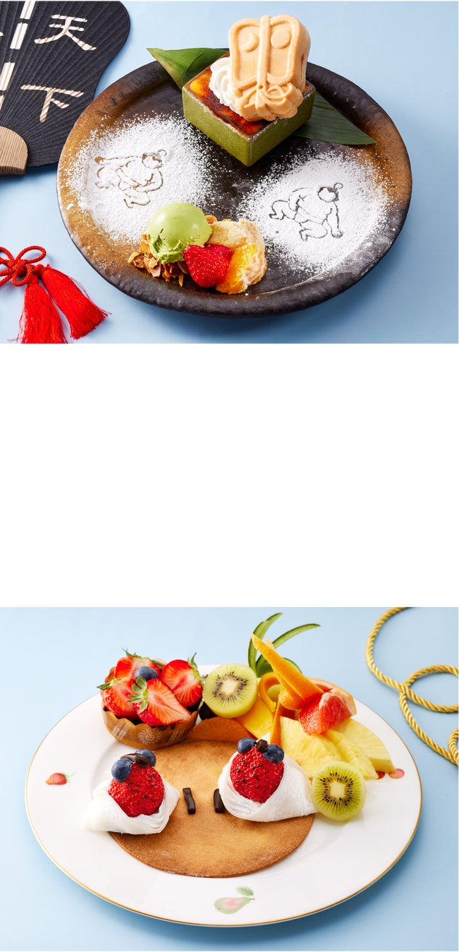 愛らしい力士に見立てた、あんこと求肥のいちご大福風和菓子が主役のデザートプレート。土俵に見立てたサクサクのクッキーの上に、濃厚なフォンダンショコラと彩り豊かなフルーツと一緒に盛り付けられています。和の上品な甘さと、洋の濃厚な味わいを一皿で贅沢に堪能できる、限定スイーツです。