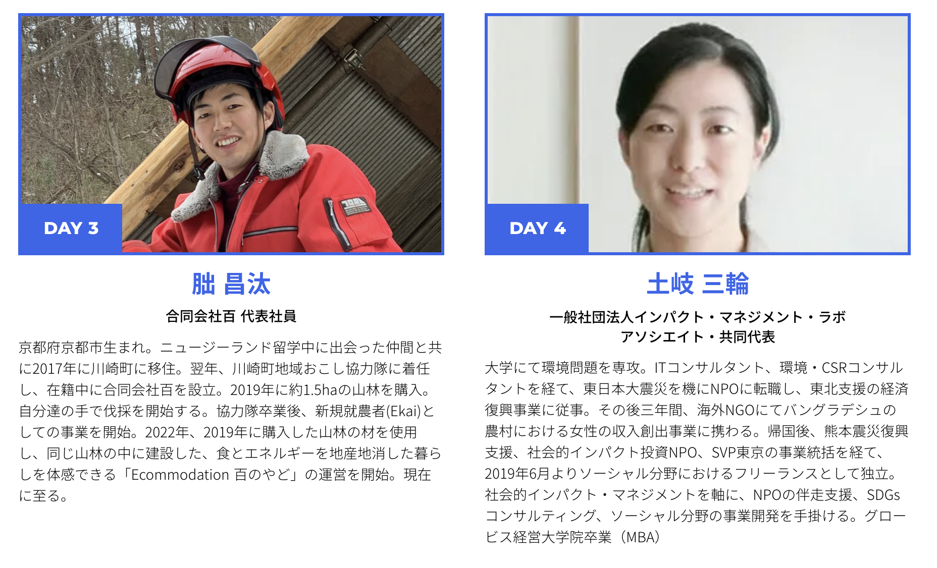 地域課題の解決にコミットしている先駆者の伴走を受けながら、課題の解像度の上げ方、解決策の生み出し方、解決策をビジネスアイデアまでブラッシュアップする方法を学び、実践していくプログラムです。
