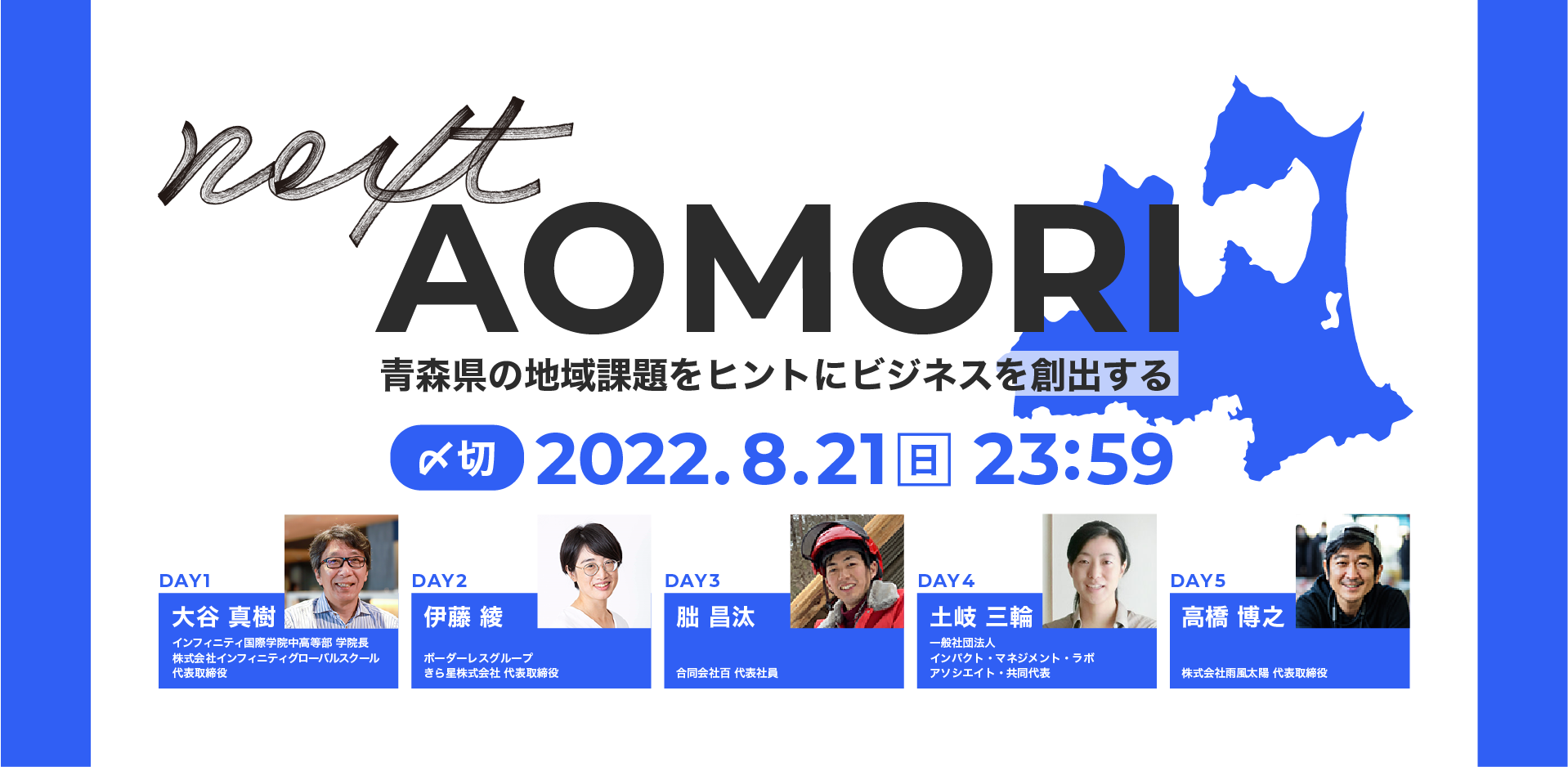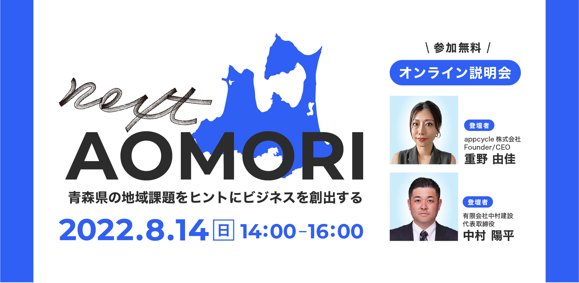 株式会社MAKOTO WILL(本社:宮城県仙台市、代表取締役 菅野永)は、青森県から事業委託を受け、県内の地域課題をヒントにしたビジネス創出プログラム「NEXT AOMORI」の募集を開始しました。県内外で地域課題の解決にコミットしている先駆者の伴走を受けながら、過疎地域における移動問題・伝統工芸の後継者不足・空き家の増加等、の地域課題を解決しうるビジネスアイデアの構築を目指します。