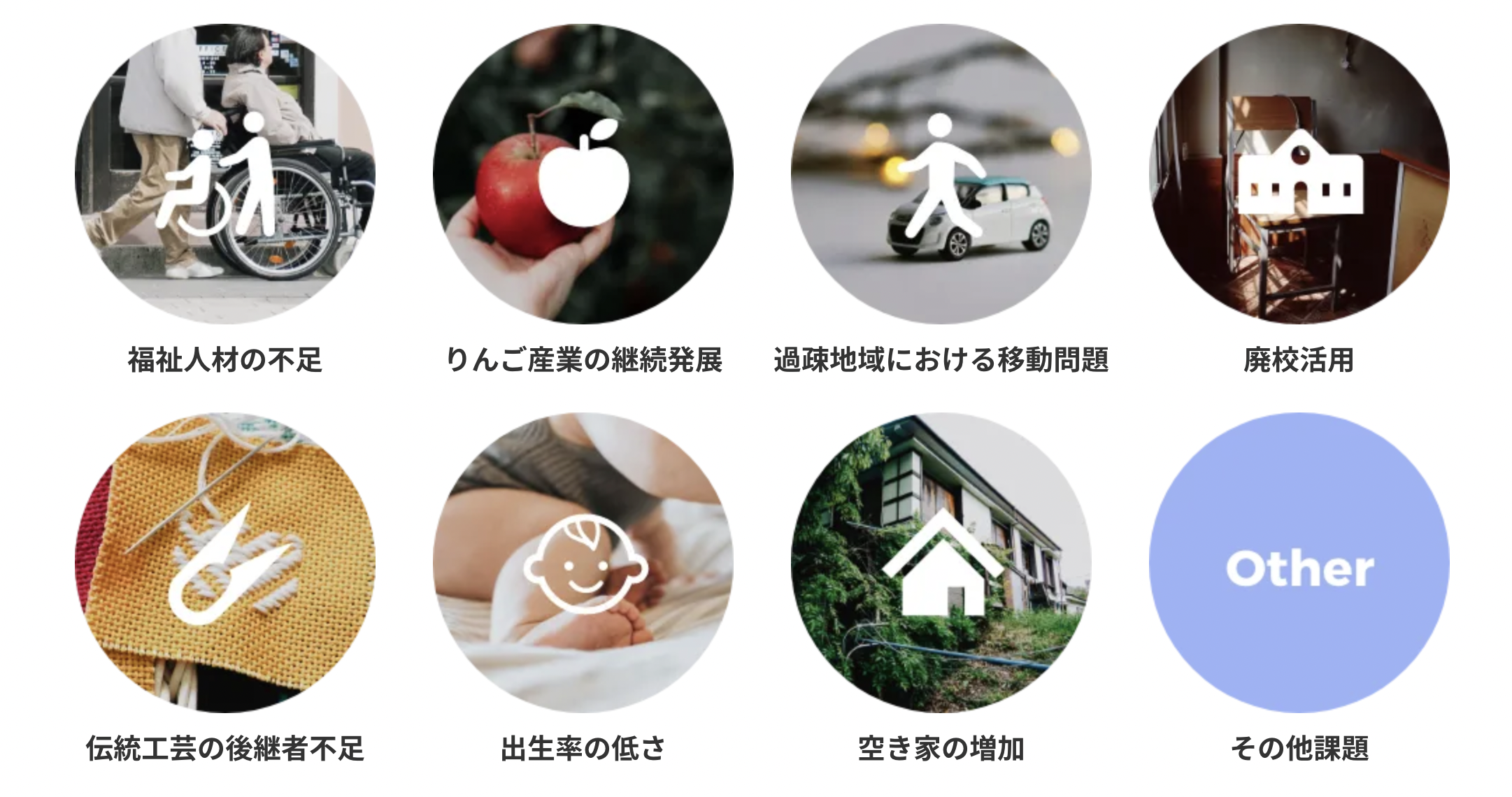 募集するビジネステーマ:福祉人材の不足/りんご産業の継続発展/過疎地域における移動問題/廃校活用/伝統工芸の後継者不足/出生率の低さ/空き家の増加/その他解決したい課題があれば応募可能