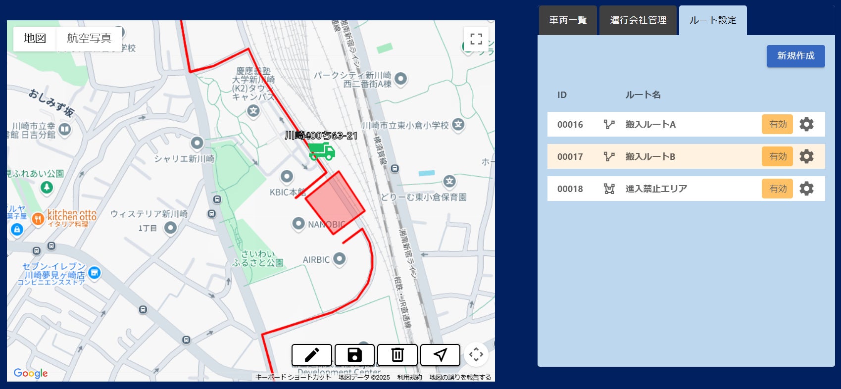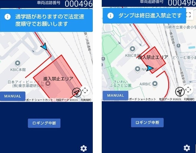 クラウドのアプリケーションを通じて、車両の経路や進入禁止エリアなどをドライバーへリアルタイムに通知することができます。また、管理者は現場に向かう車両をマップ上で随時把握することができ、工程管理に生かすことができます。