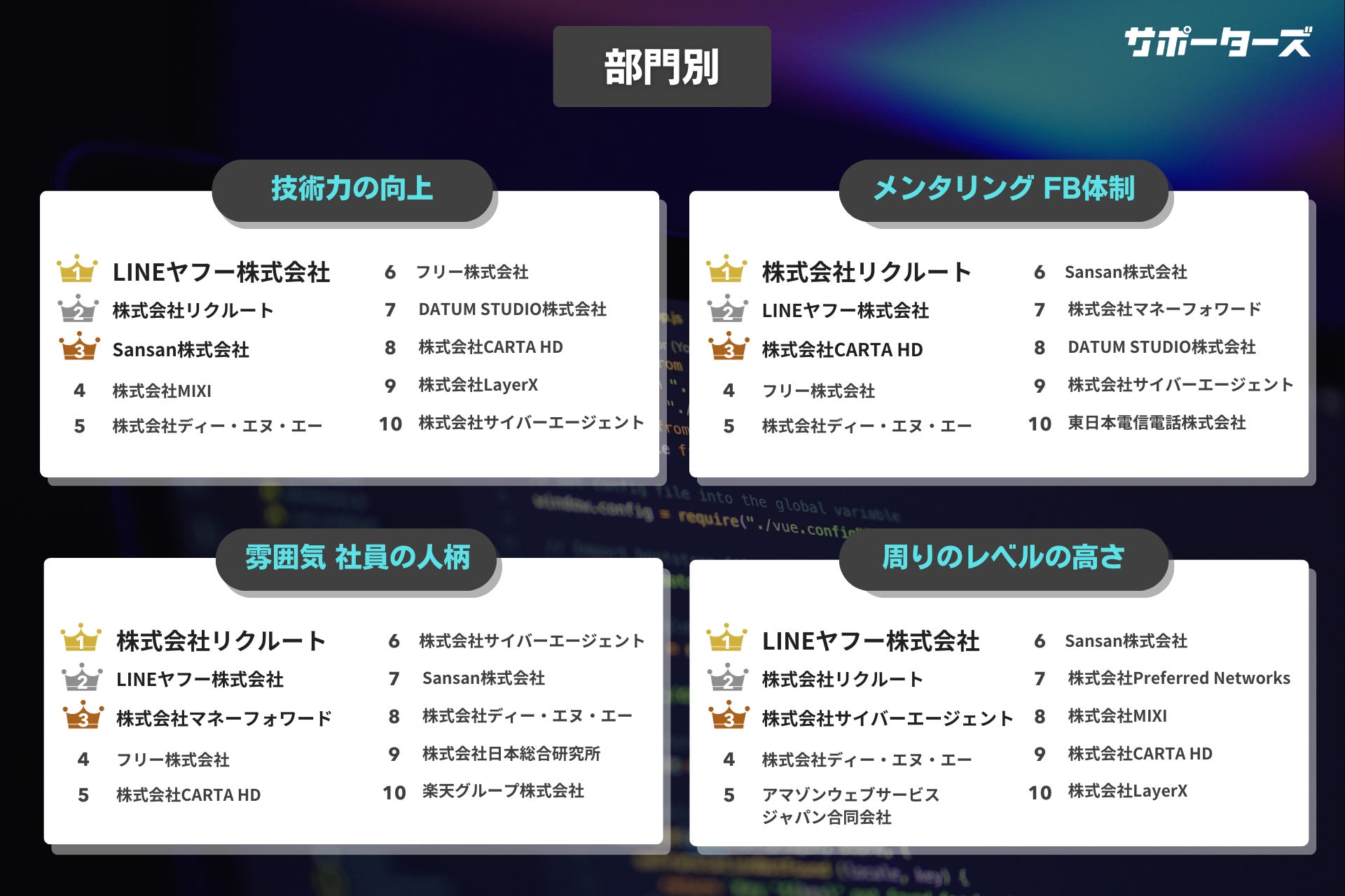 LINEヤフー社が総合ランキングで初めて1位、部門別ランキングにおいては「技術力の向上」「周りのレベルの高さ」の2部門で1位、「メンタリング・FB体制」「雰囲気・社員の人柄」の2部門で2位を獲得し、総合的に満足度の高いインターンシップを実現していることが分かりました。