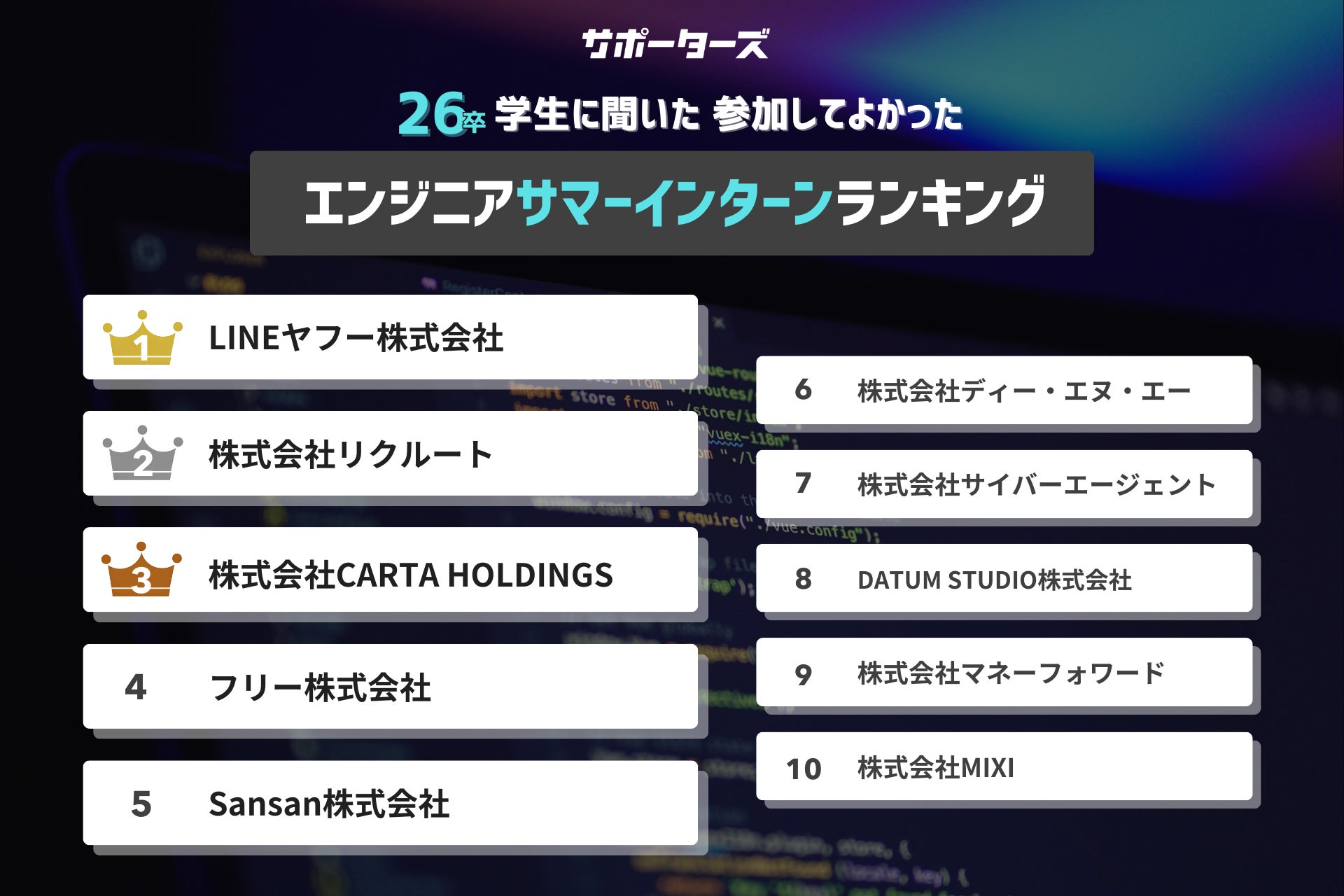 株式会社CARTA HOLDINGSのグループ会社で、国内最大級のエンジニア学生のデータベースを持つ株式会社サポーターズ(東京都港区、代表取締役:楓 博光)は、2026年卒業予定の学生を対象に調査を実施し、「参加してよかったエンジニアサマーインターンシップランキング2025」を公開しました。本調査は、企業がエンジニア向けのインターンシップを企画する際の参考として活用し、学生にとって実りあるインターンが増えることを目的としています。今年で4度目の実施となり、今後も継続的な調査を実施する予定です。(2024年度の調査結果は、こちらよりご覧ください)