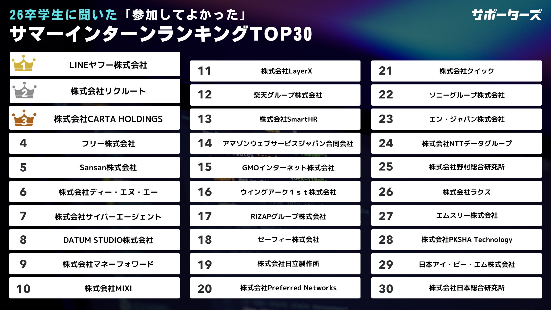 サポーターズ、「参加してよかったエンジニアサマーインターンシップランキング2025」発表