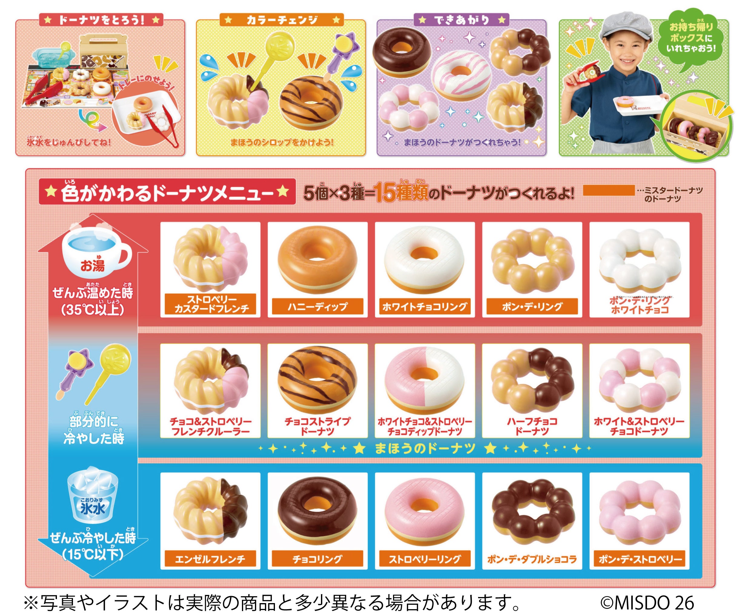 お部屋でもおふろでも遊べる大人気シリーズに、「ミスタードーナツ」が仲間入り。 お湯と氷水を使うだけで、ドーナツの色が変わったり、カラフルな模様が浮き出たりとまるで魔法みたい!人気のドーナツは全部で5種類。それぞれ色変化が楽しめるので、作れるバリエーションは全部で15種類も。トングでお気に入りのドーナツをトレイにのせて、自分だけのオリジナルドーナツを作れます。 本物そっくりのお持ち帰りボックスに入れれば、気分はすっかり店員さんです。