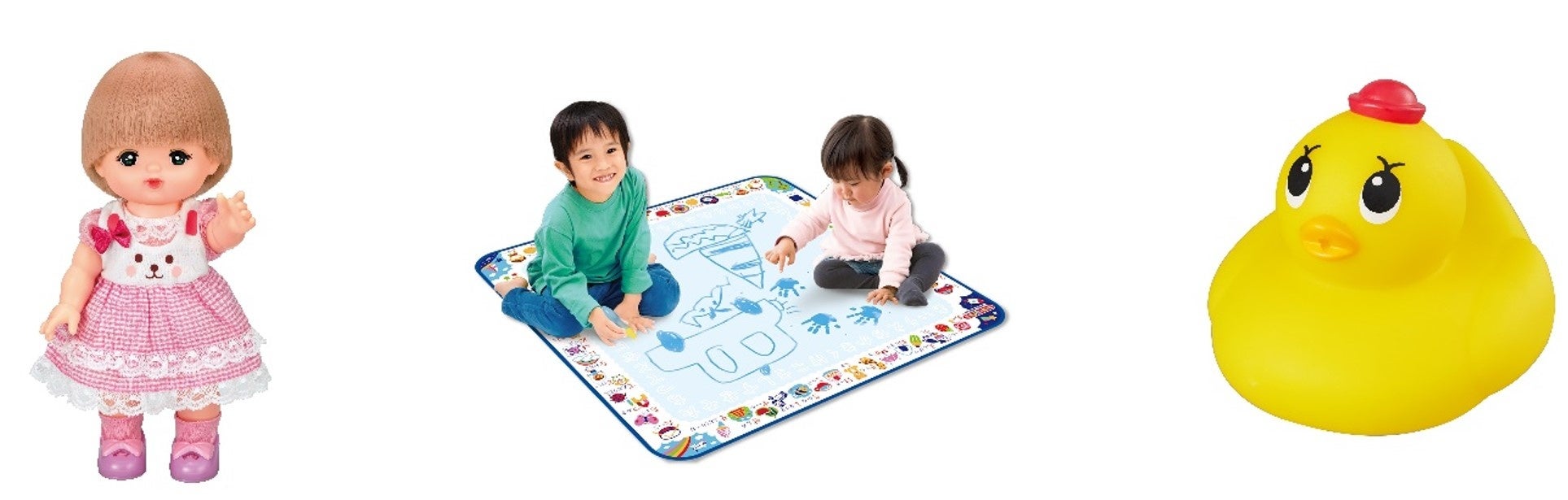 当社では、温度の変化で色が変わるインキ「メタモインキ」を応用し、未就学児童向けの知育玩具をはじめとする様々な玩具の企画開発を行っております。主な商品に「スイスイおえかき」シリーズ、抱き人形「メルちゃん」シリーズがあります。いずれもロングセラー商品で「スイスイおえかき」は発売26年目、「メルちゃん」は発売34年目を迎えました。今年で25年目を迎えた「アヒル隊長」なども含め、これからも玩具を通じ、子供たちに感受性と創造性をのばす「夢と小さな驚き」を提供し続けます。