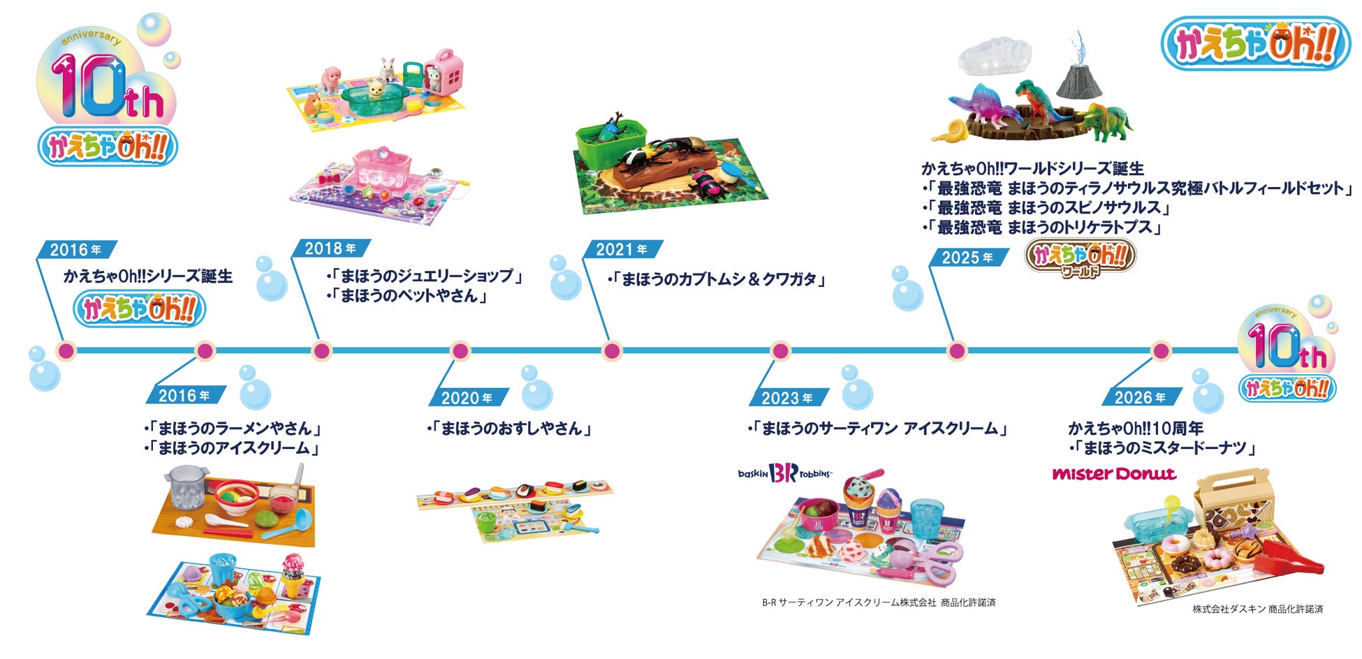 2016年に発売された「かえちゃOh!!」シリーズは、2026年で10周年を迎えました。お湯と氷水で何度でも色が変わる、おふろでもお部屋でも遊べる玩具商品です。10周年を迎える2026年は、ミスタードーナツとのコラボ商品「まほうのミスタードーナツ」が新発売となります。これからも「かえちゃOh!!」シリーズは、子どもたちに楽しさや驚きを提供してまいります。