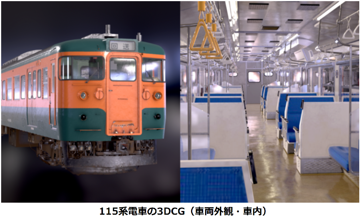 半世紀近く走り抜いた、長い歴史を持つ115系電車とEF64形電気機関車を、「あたかも本物の車両」としてARで出現させるため、さまざまな方向から撮影した大量の写真を合成して3DCGを生成する、「フォトグラメトリ」技術を採用しました。CG表現においては、車両の経年変化、傷、修復跡なども再現し、車両本体の鋼材や塗装の質感、車両内は座席モケットから網棚、つり革に至るまで、忠実に再現しています。