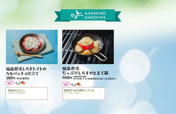 食材は、毎年ご好評の桃やお米、夏野菜、メヒカリ、アオサノリと、さらに今年は、色鮮やかで良質な霜降りと風味豊かでまろやかな味わいが特徴の福島牛、豊かな香りとふわふわな食感のしらすを使用。福島県で採れた食材で旬の味覚を味わうことのできる幅広いメニューラインアップです。