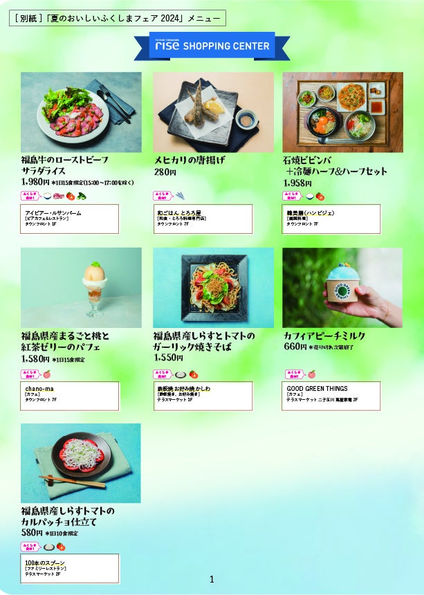 株式会社東急モールズデベロップメント(本社所在地:東京都渋谷区、代表取締役社長:佐々木桃子、以下:当社)は、「発見!ふくしま」※とタイアップし、当社が運営するショッピングセンター(以下:SC)内の飲食店舗(一部)にて、毎年ご好評いただいている福島県産の選りすぐりの食材が楽しめる「夏のおいしいふくしまフェア2024」を、今年も期間限定で開催します。