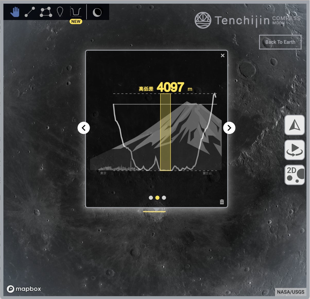 クレーターの大きさ(深さ)を、地球上の高いものと視覚的に比較することができます。選択したクレーターの深さに応じて、表示される指標が東京の超高層ビル群や、富士山、地球最高峰のチョモランマなどに変化します。さらに高低差が大きい場合は別の表示に変化します。