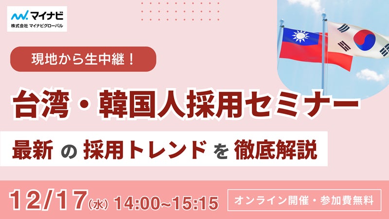 株式会社マイナビグローバル(本社:東京都千代田区、代表取締役 社長執行役員:杠元樹、マイナビグループ)は、2025年12月17日(水)に外国人採用セミナー「台湾・韓国から生中継!最新の採用トレンドを徹底解説」をオンラインにて開催します。インバウンド需要の高まりに伴い、台湾・韓国人材の採用ニーズが急増する中、現地の最新就職事情や採用戦略を解説します。