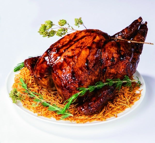 作中に出てくる「バジリスク」(鶏の胴体に蛇の尾を持つ魔物)を丸鶏で代用しました。お腹に詰めたハーブとガーリックが効いた、ワイルドな逸品です。