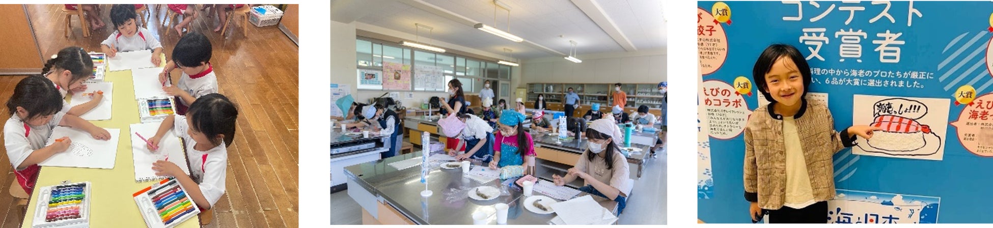 当協会では、2021年より毎年「えび丸ごと夢の料理コンテスト」という企画を開催しています。幼稚園・保育園の園児から高校生までを対象に、解剖を通して海老などの水産物について理解を深めてもらおうという企画です。解剖後は、海老を丸ごと使った料理のレシピを考え、コンテストを開催。優秀作品は一流レストランのシェフが製作したり、イベントにて販売されたり、商品パッケージに使われたりしています。なお、解剖に使う有頭海老は、当協会から無償提供しています。