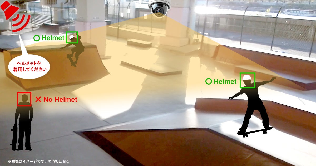AWLは、エッジAI映像解析技術を用いてリアルタイムで公園管理・監視の強化を支援します。具体的には、ヘルメット未着用者を検知し、リアルタイムでアラート(音声)を発し、遠隔地からの音声で未着用者に直接注意喚起します。これにより、職員が現地に出向くことなく、問題行動(ヘルメット未着用)の検知と予防を行えるようにします。
