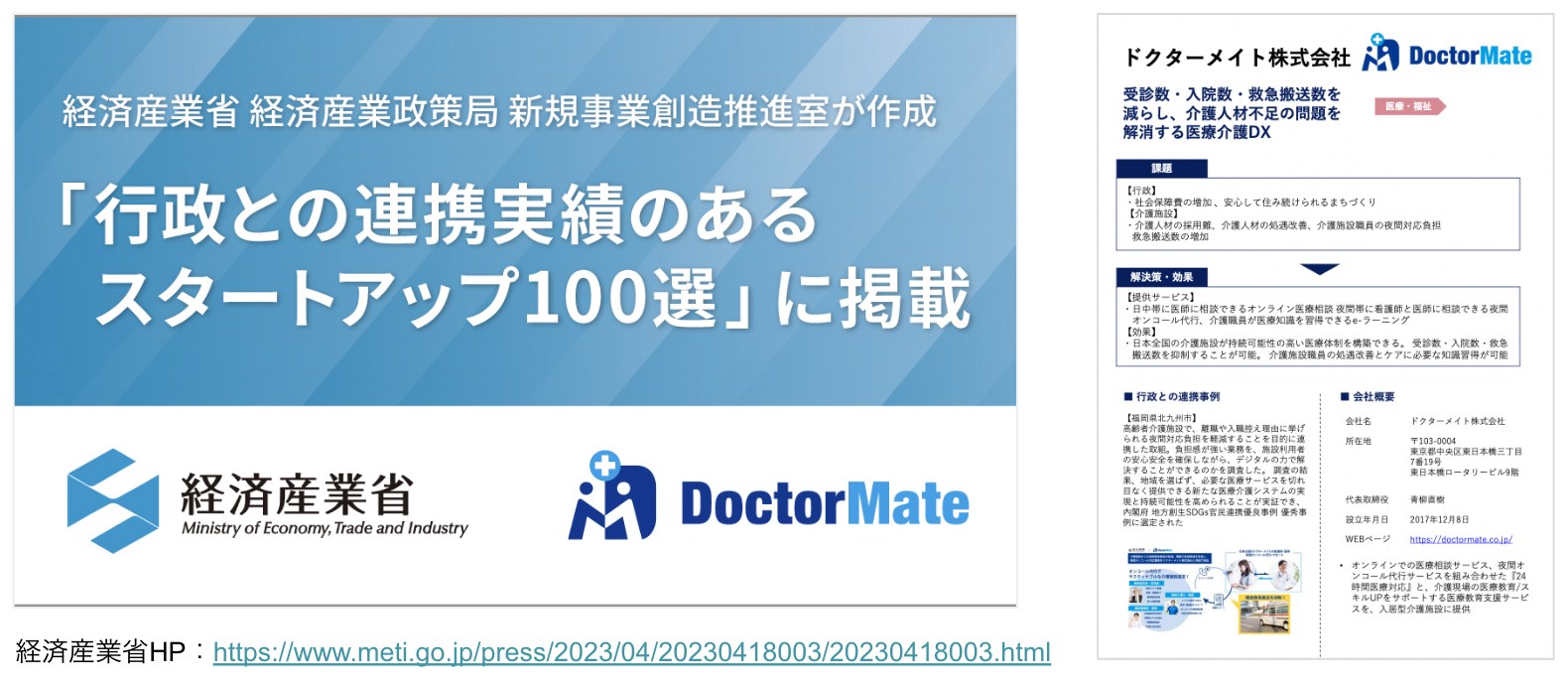 また、スタートアップと政府・自治体との連携促進に向けて、経済産業省が制作した「行政との連携実績のあるスタートアップ100選」に掲載されました。