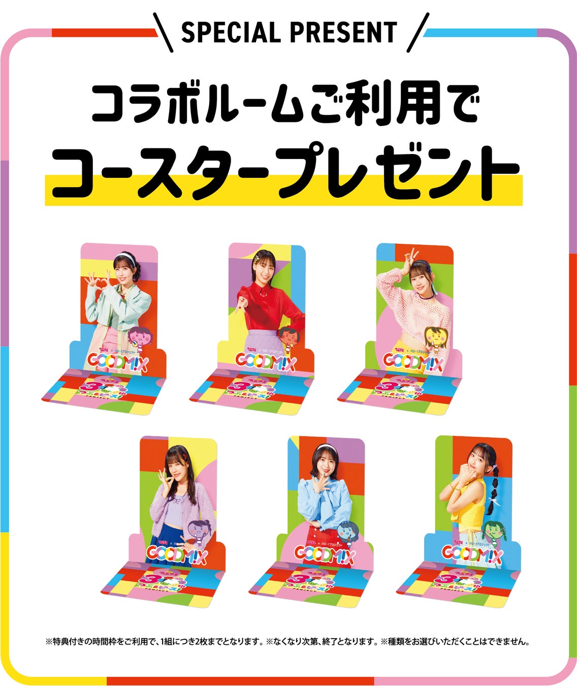 2024年3月1日(金)~3月30日(土)の期間限定で、株式会社第一興商が運営するカラオケルーム ビッグエコーの3店舗(秋葉原電気街口駅前店、名駅笹島交差点前店、なんばアムザ店)にて「GOODM!Xコラボキャンペーン」を実施。GOODM!Xメンバーの写真で装飾した「GOODM!Xルーム」を設置し、特典付きの時間枠をご利用のお客様にGOODM!Xメンバー写真入りコースターを1組につき2枚プレゼントいたします。またキャンペーン実施店舗限定で、つぶグミを使った全6種のコラボドリンクを販売し、ご注文のお客様にはつぶグミちゃん(GOODM!Xver.)ステッカーを1杯につき1枚プレゼントいたします。