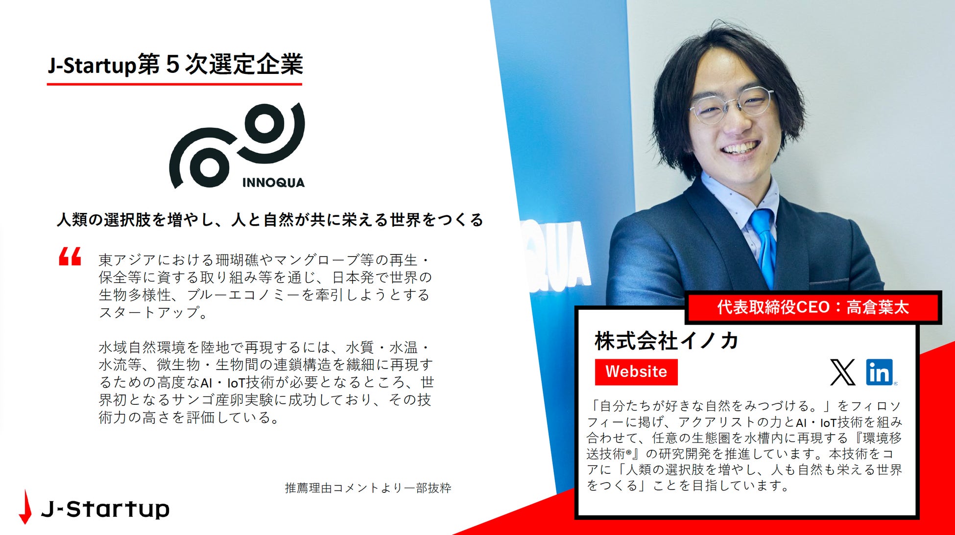 株式会社イノカ(本社:東京都文京区、代表取締役CEO:高倉葉太、以下「イノカ」)は、経済産業省が運営するスタートアップ支援プログラム「J-Startup」の第5次選定企業に選出されたことをお知らせします。