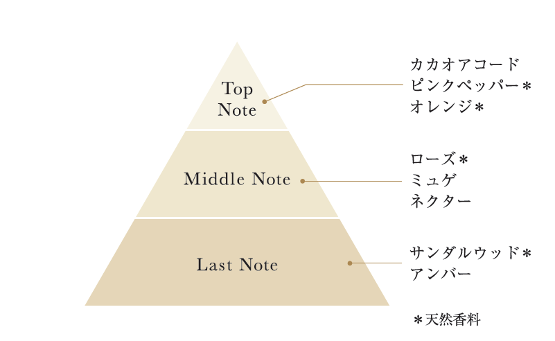 ラストノートにはサンダルウッドやアンバーが香り立ち、しっとりとした落ち着きと大人の色香をもたらしてゆく。