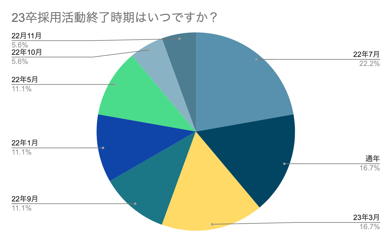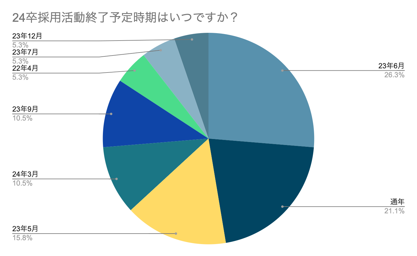 前述の通り、当社実績では23卒および24卒を比較すると内々定を出し始める時期に一定の差分が発生しているように見受けられましたが、回答内容を比較してみると23卒の採用終了時期に関し、「22年7月」が最も回答数として多かったのに対し、24卒に関しては「23年6月」が最も多数を占めており、全体として採用活動が1ヶ月程度前倒しになっている傾向が見えました。