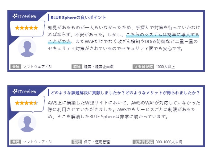 BLUE Sphere(ブルー スフィア)を提供する株式会社アイロバ(代表取締役:小林 直樹、以下「アイロバ」)は、2024年7月、アイティクラウド株式会社(本社:東京都港区、代表取締役社長 兼 CEO:黒野 源太)が発表した、掲載された製品レビュー(口コミ)をもとに選定され顧客満足度の高い製品に送られる「ITreview Grid Award 2024 Summer」において WAF部門で「 Leader 」を受賞しましたのでお知らせいたします。