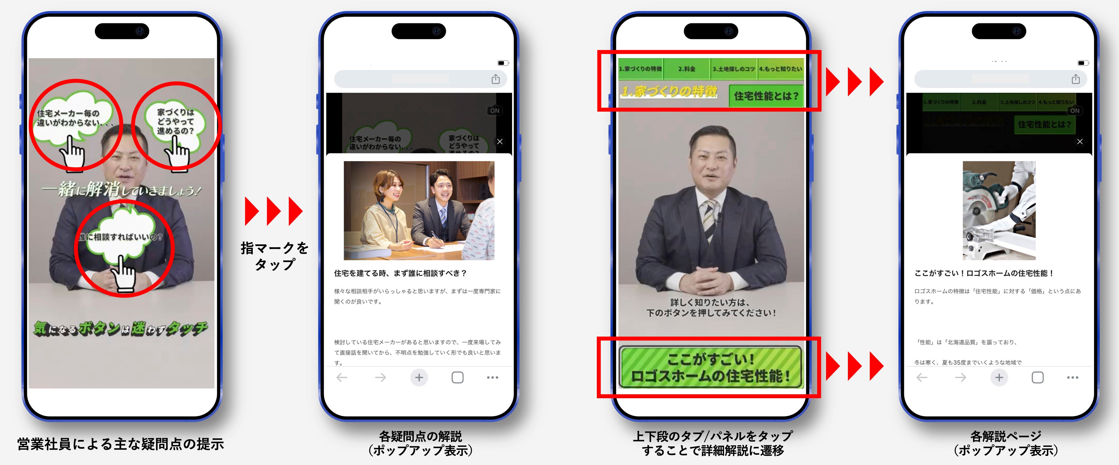 営業社員が住宅性能や特徴などをわかりやすく解説したインタラクティブ動画をwebサイトのトップページにフローティング形式*で掲出。膨大な量のテキストと静止画で構成されるwebサイトではユーザーが知りたい情報を探し出せずに離脱してしまう課題があります。それに対し、トップページでユーザーの知りたい情報を動画の中から”直感的”に”自ら”選択して視聴でき、詳細情報を提供することで興味理解を醸成かつ離脱を抑制し、来店予約の申込率向上を実現します。