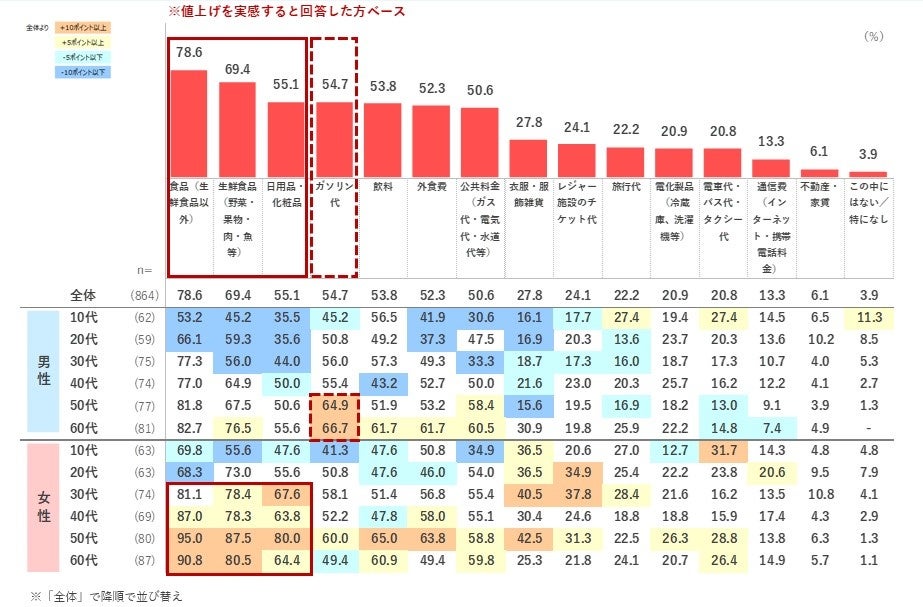 続く「ガソリン代」は全体の54.7%が選択しており、特に男性50代~60代では全体より10ポイント以上上回っています。