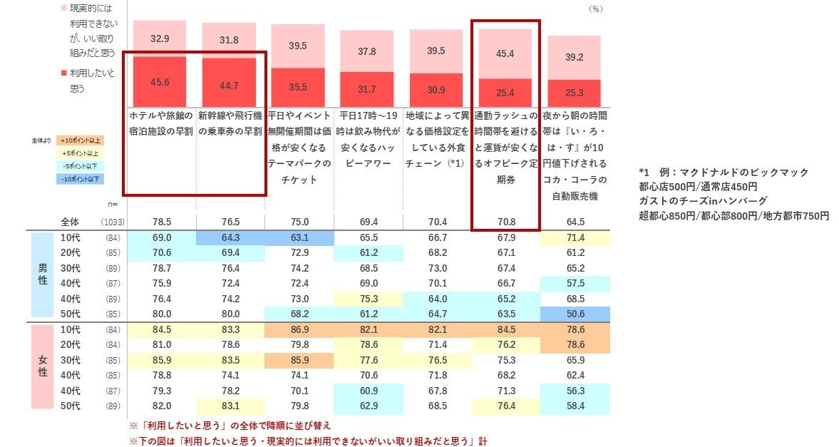 時間帯や時期、地域によって価格を変動する『ダイナミックプライシング』の受容を確認したところ、 「ホテルや旅館の宿泊施設の早割」を「利用したいと思う」で45.6%と最も多く、次に「新幹線や飛行機の乗車券の早割」が44.7%と続きます。旅行関連の早割は意識次第で利用できる機会も広がるため支持されている様子です。
