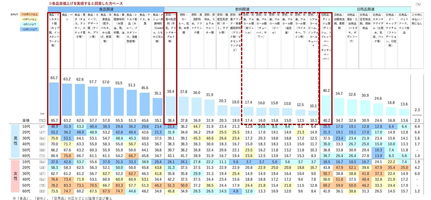 続いて値上げを実感する品目の中でも食品/飲料/日用品を抜粋して詳細を確認しました。