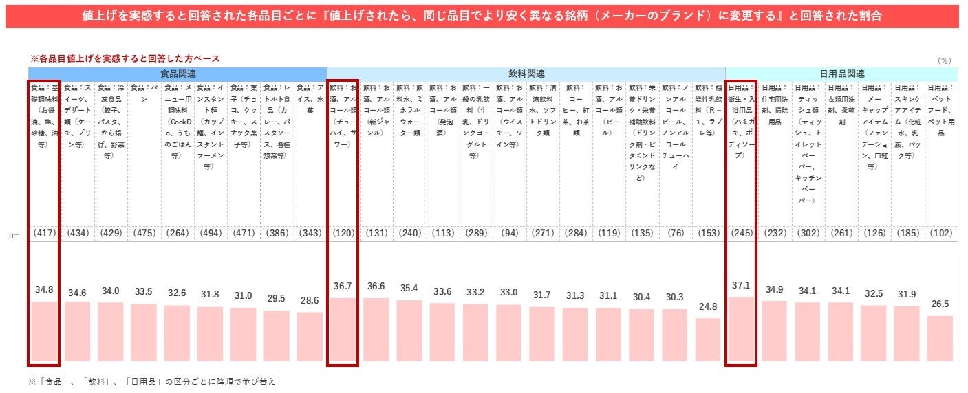 値上げを実感する品目について、『値上げされたら、同じ品目でより安く異なる銘柄(メーカーのブランド)に変更する』と回答された割合をみると、食品関連では「基礎調味料(お醤油、塩、砂糖、油等)」が34.8%と最も高いですが、他商品もほぼ横並びとなっています。飲料関連では「お酒、アルコール類(チューハイ、サワー)」が36.7%と最も高くなっていて、こちらも他商品とほぼ横並びです。日用品関連では「衛生・入浴用品(ハミガキ、ボディーソープ)」が37.1%と最も高く、次に「住宅用洗剤、掃除用品」が34.9%と続きます。