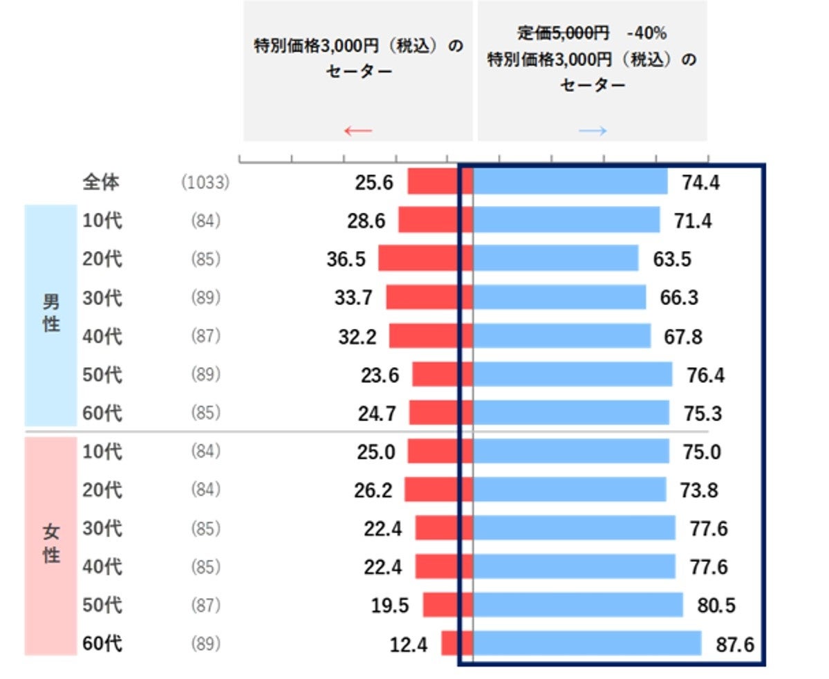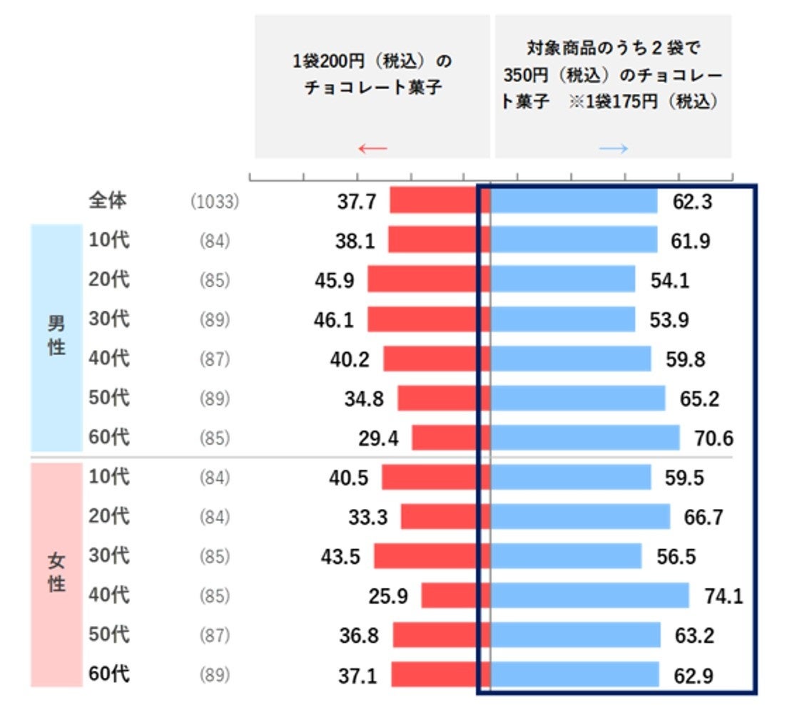 続いてスーパーやドラックストアでよく見る、『まとめ買いすると一つあたりの金額が安くなる』価格設定について確認したところ、いずれの性年代も「対象商品のうち2袋で350円(税込)」の割合が高くなりました。1袋だけで抑えれば200円の方が安いですが、合計金額は高くなるものの単価が安いまとめ買いをついつい選んでしまいがちです。