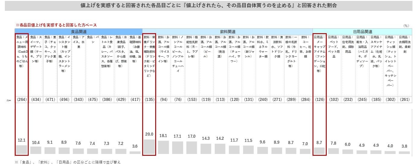 値上げを実感する品目について、『値上げされたら、その品目自体買うのを止める』と回答された割合をみると、食品関連では「メニュー用調味料(CookDo、うちのごはん等)」が12.1%と最も高くなっています。飲料関連では「栄養ドリンク・栄養補助飲料(ドリンク剤・ビタミンドリンクなど) 」が20.0%と最も高くなっています。いずれも効率の良さ・手軽さが魅力だが、値上げされたら他の手で代用するといった意見もあるのではないでしょうか。日用品関連では「メーキャップアイテム(ファンデーション、口紅等) 」が8.7%と最も高くなっています。