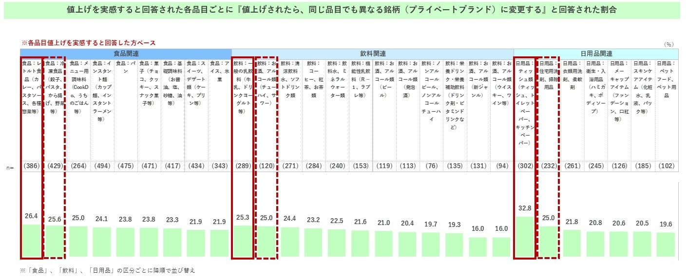 値上げを実感する品目について、『値上げされたら、同じ品目でも異なる銘柄(プライベートブランド)に変更する』と回答された割合をみると、食品関連では「レトルト食品(カレー、パスタソース、各種総菜等)」が26.4%と最も高く、次に「冷凍食品(餃子、パスタ、から揚げ、野菜等)」が25.6%と続きます。飲料関連では「一般の乳飲料(牛乳、ドリンクヨーグルト等) 」が25.3%と最も高いですが、他商品もほぼ横並びとなっています。日用品関連では「ティッシュ類(ティッシュ、トイレットペーパー、キッチンペーパー) 」が最も高く32.8%で、次に「住宅用洗剤、掃除用品」が25.0%と続きます。