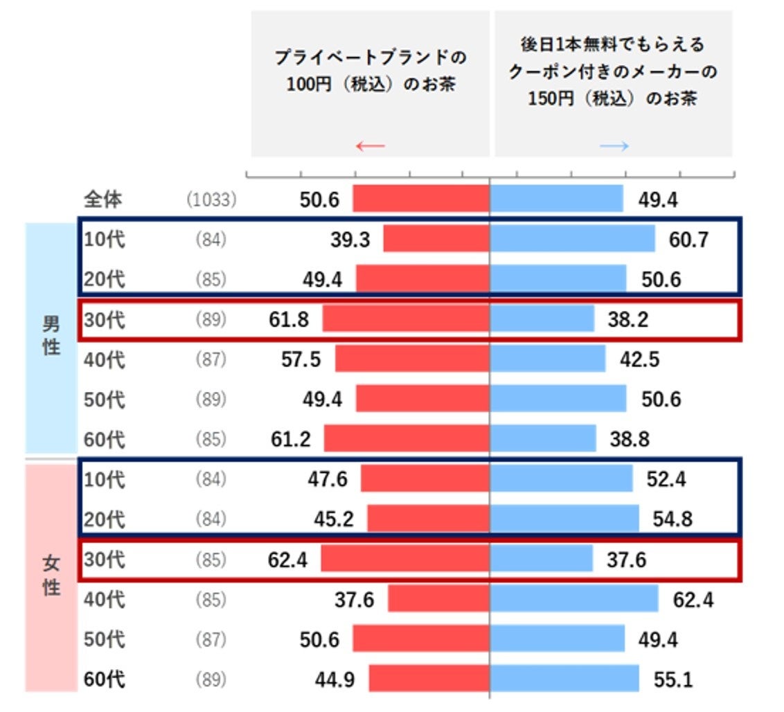まず、最近コンビニなどでよく見かける『1本買うと無料引換券がもらえるサービス』を例に聴取したところ、全体値ではほぼ五分五分で、性年代別ではばらつきが見られました。男女共通の回答傾向にある年代に着目すると、10代~20代は「無料クーポン付きのメーカーの150円(税込)のお茶」に、30代は「プライベートブランドの100円(税込)のお茶」に傾いています。